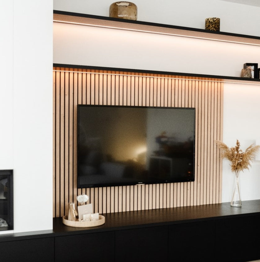 - Composition : Panneau HDF 10 mm et lattes en MDF 10 x 30 mm recouvertes de papier décoratif.
