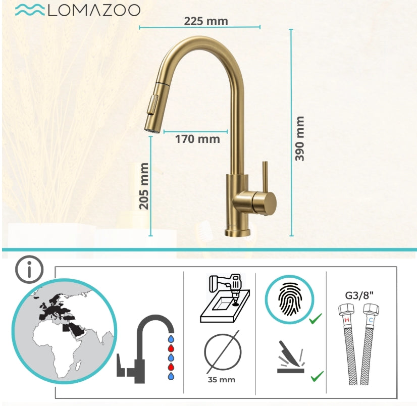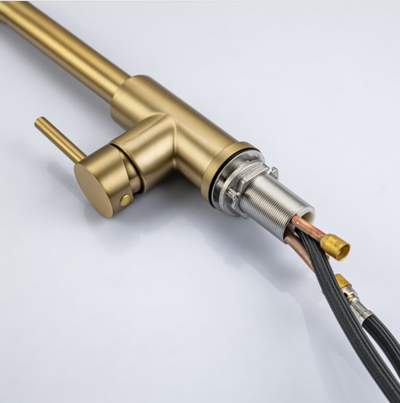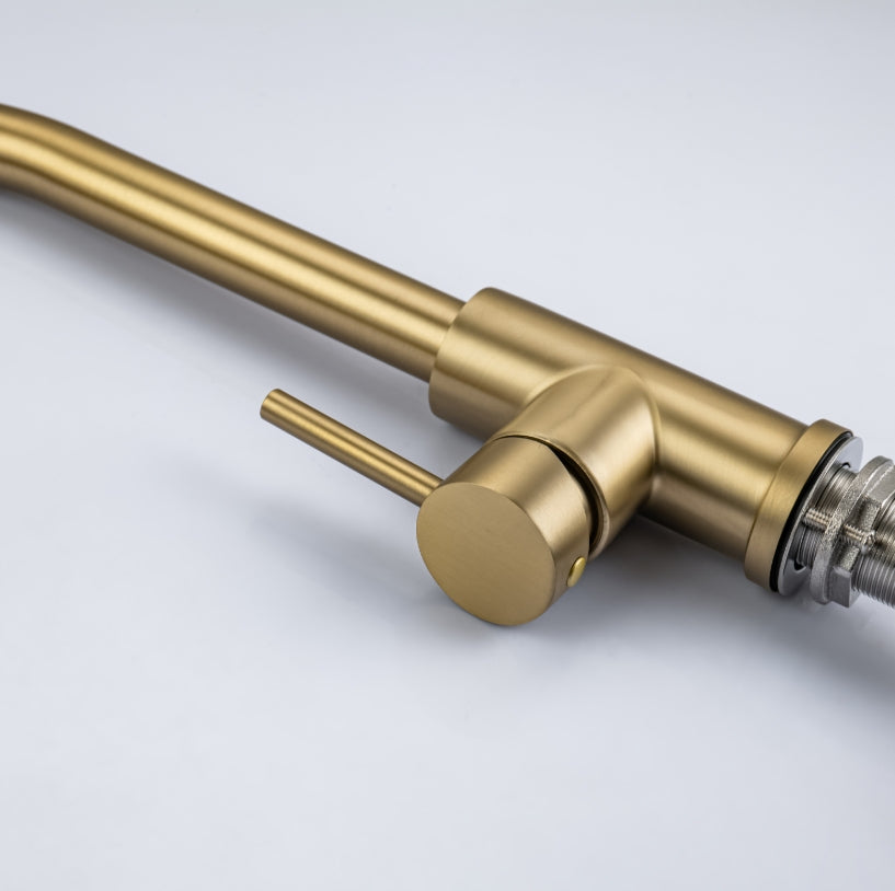 Apportez une touche moderne et sophistiquée à votre cuisine avec le robinet LIMAZA Sphinx. Conçu pour allier design raffiné, durabilité et confort d’utilisation, ce mitigeur en acier inoxydable doré brossé transforme votre quotidien en offrant un débit fluide et optimal.
